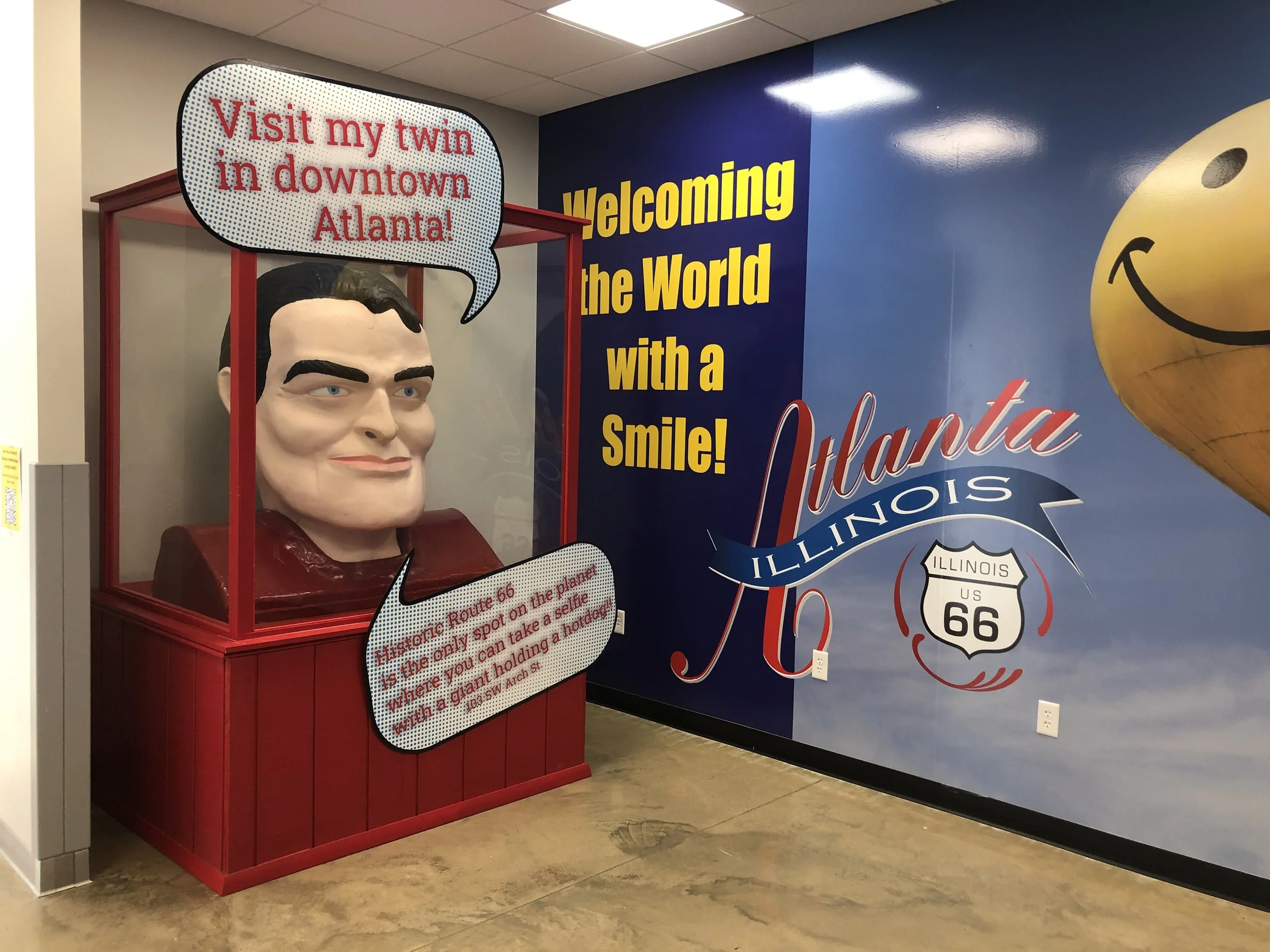 Don’t forget to visit an original International Fiberglass Muffler Man head at the Shell truck stop in Atlanta, IL by the Dairy Queen. The exhibit is located just inside and features an original head from a long lost giant that was used in the San Diego, CA area in the 60s and 70s. The head has also been displayed at Burning Man!